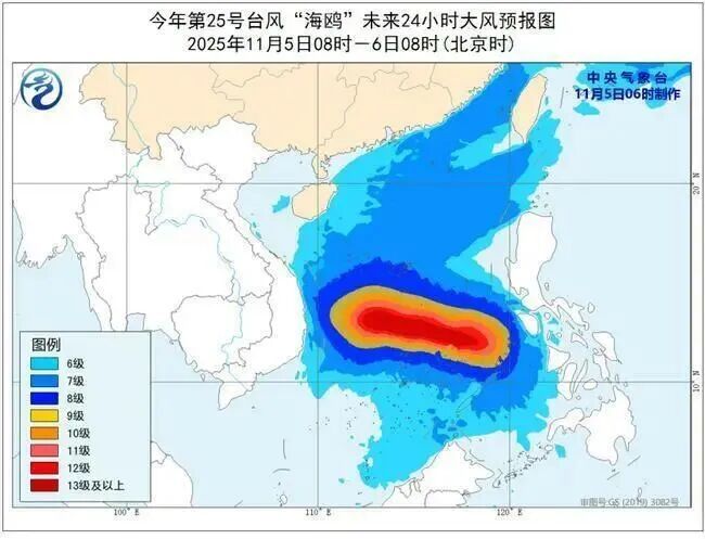 受今年第25号台风“海鸥”(台风级)和冷空气的共同影响,预计11月5日上午到6日上午,南海中部将出现6到9米的狂浪到狂涛区,南海北部将出现3到5米的大浪到巨浪区,近海海域海浪预警级别为橙色;
