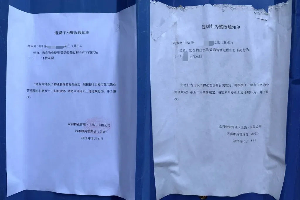 6月6日,四季雅苑小区物业公司开具了第一张《违规行为整改通知单》,指出业主在物业使用/装饰装修过程中有“下挖花园”行为,违反了物业管理的有关规定,要求立即停止违规行为,并予整改。