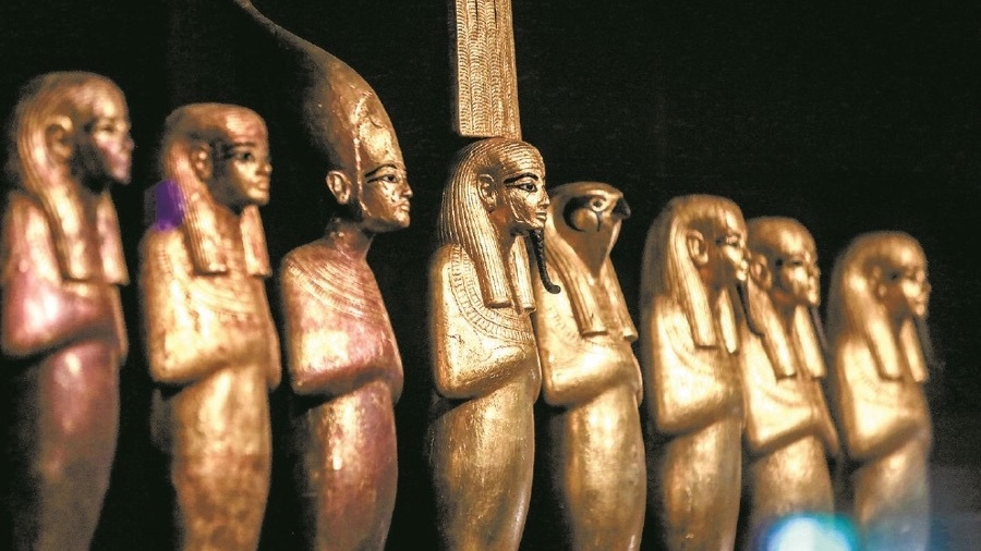 毫无疑问,主展厅的核心光芒聚焦于图坦卡蒙(Tutankhamun)法老。这是埃及考古史上迄今唯一一座保存完好的法老陵墓,也是最豪华的法老陵墓,其5000余件随葬品首次完整地集中在同一展厅向世人展示。这位生平短暂而神秘的第18朝法老去世时不过19岁,却留下了一个文明的缩影。他的墓葬的影响甚至超越了他的生前功绩。正如发现陵墓的英国考古学家霍华德·卡特曾精辟地总结:“图坦卡蒙一生最出色的贡献就是他死了,并且被很好地埋葬。”