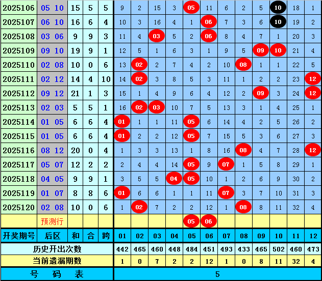 后区分析(定义:01-04为一区,05-08为二区,09-12为三区):上期后区开出奖号02和08,分别出现在第一区和第二区和区,最近10期后区三个区间落号个数比为8:8:4,本期后区看好第二区号码大热,注意两码05、06。